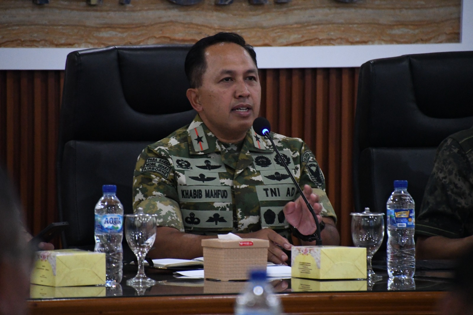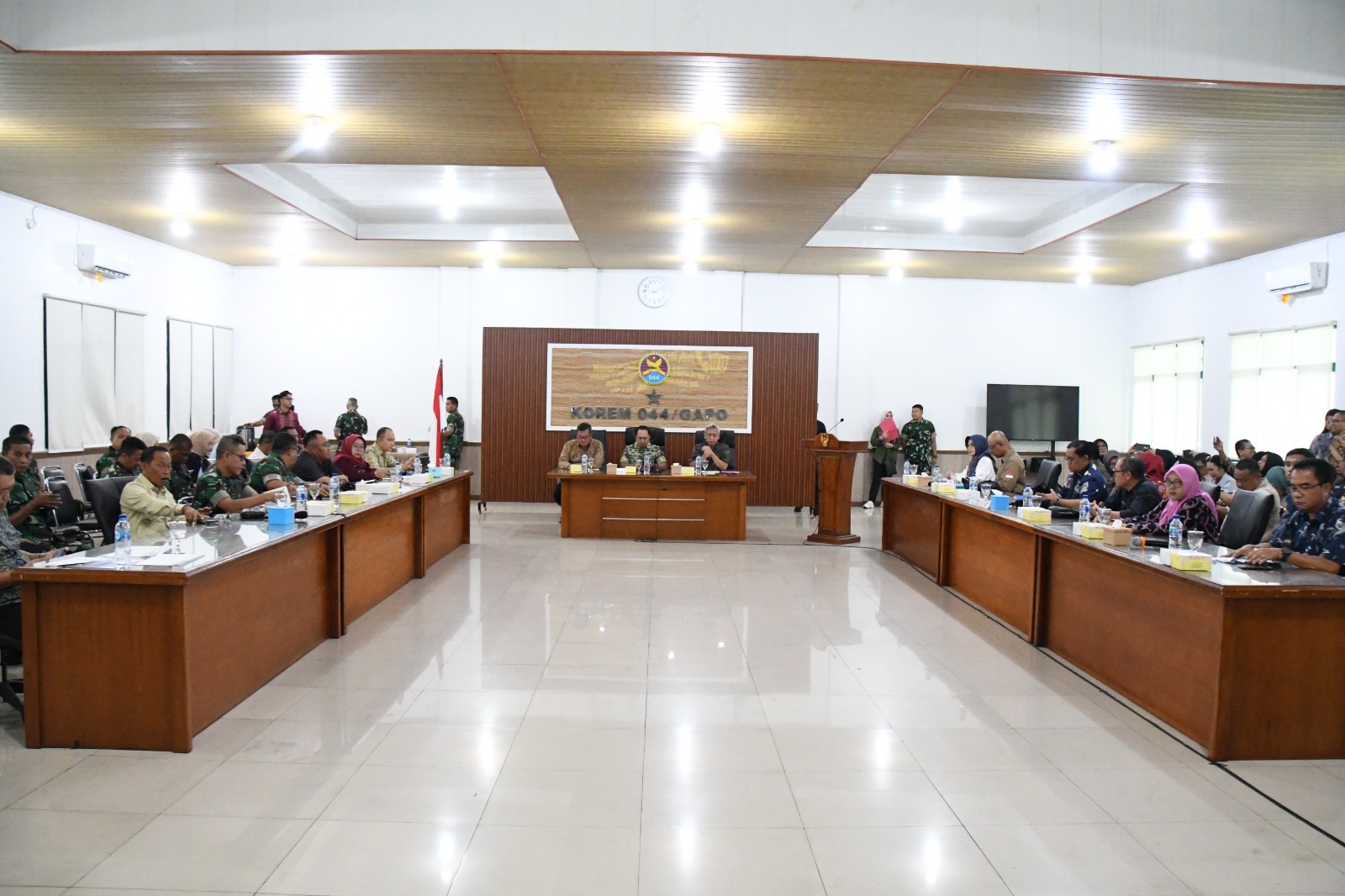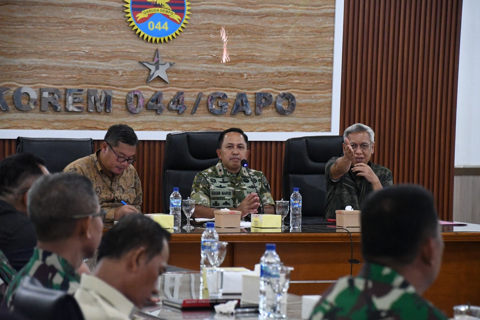 Rapat yang digelar di Aula Makorem 044/Gapo dihadiri secara langsung Danrem 044/Garuda Dempo Brigjen TNI Khabib Mahfud, S.I.P., M.M, Jumat (10/4/2026).