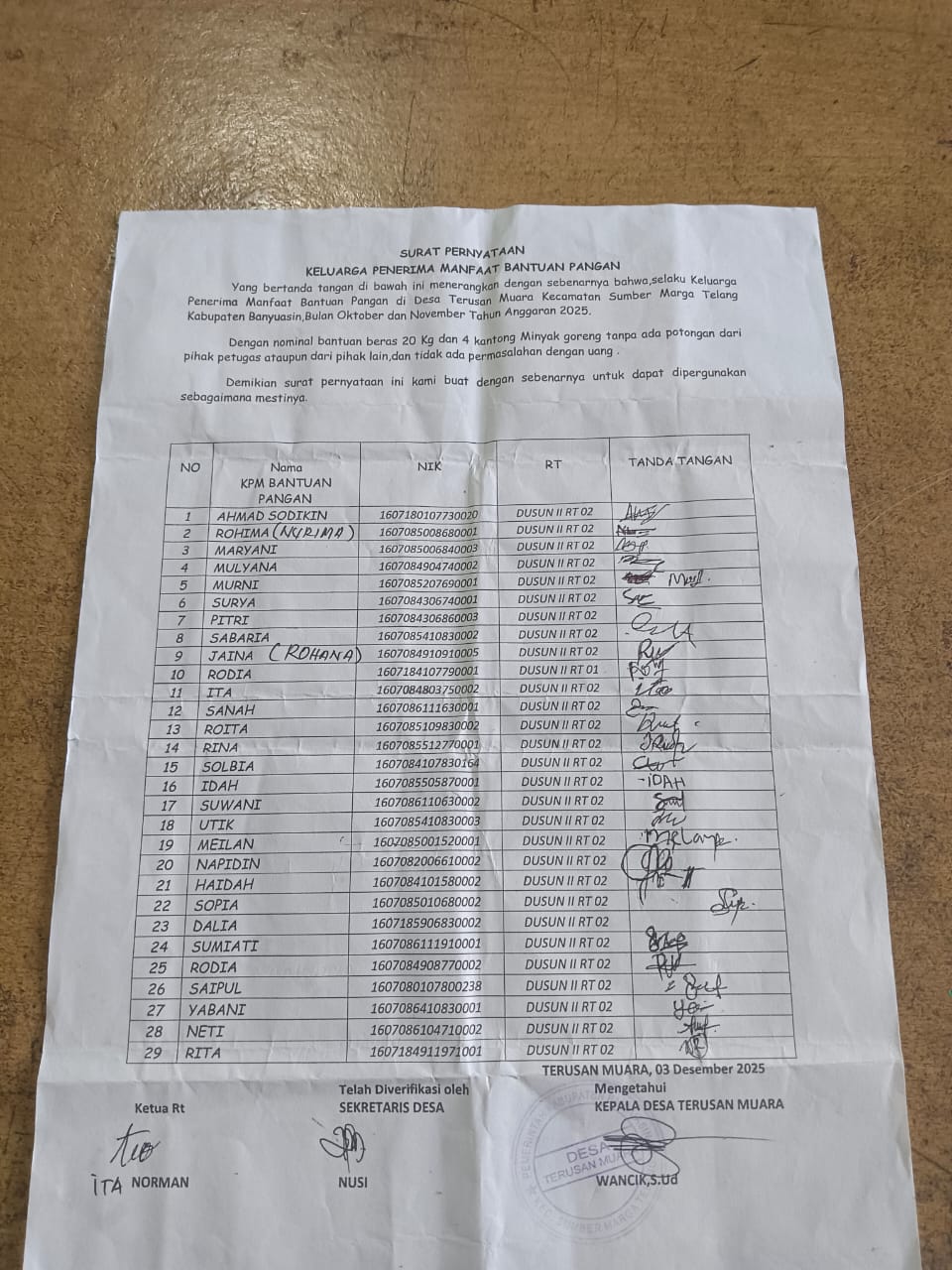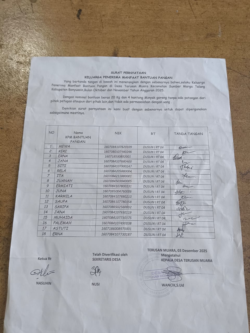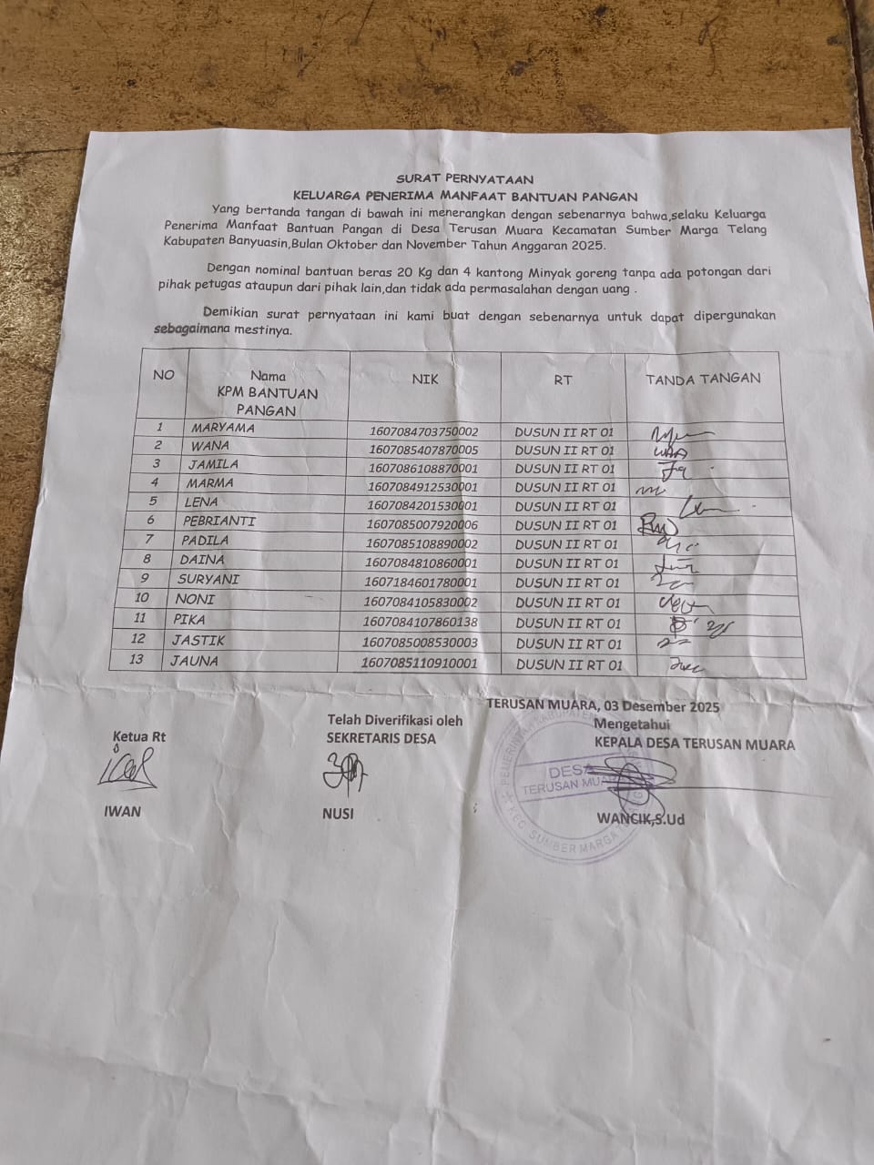 Bansos yang diterima utuh tanpa adanya potongan sedikit pun, Bantuan dari pemerintah pusat yang diterima utuh oleh masyarakat Desa Terusan Muara Kecamatan Sumber Marga elang, Senin 8/12/2025.