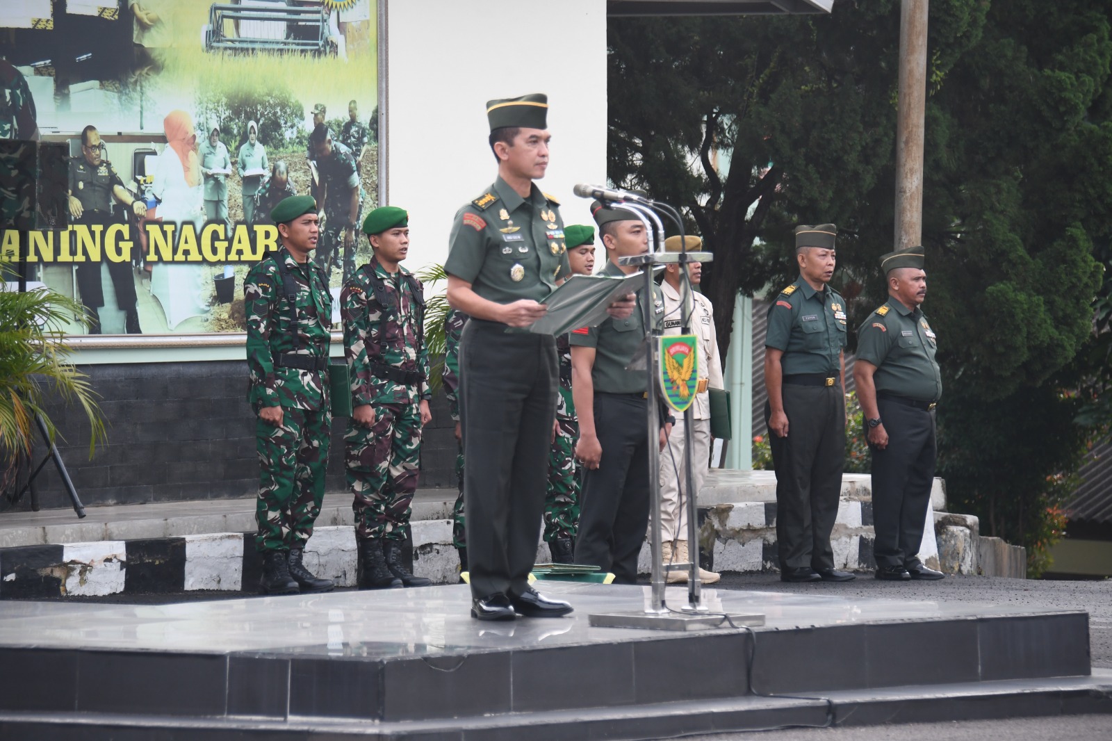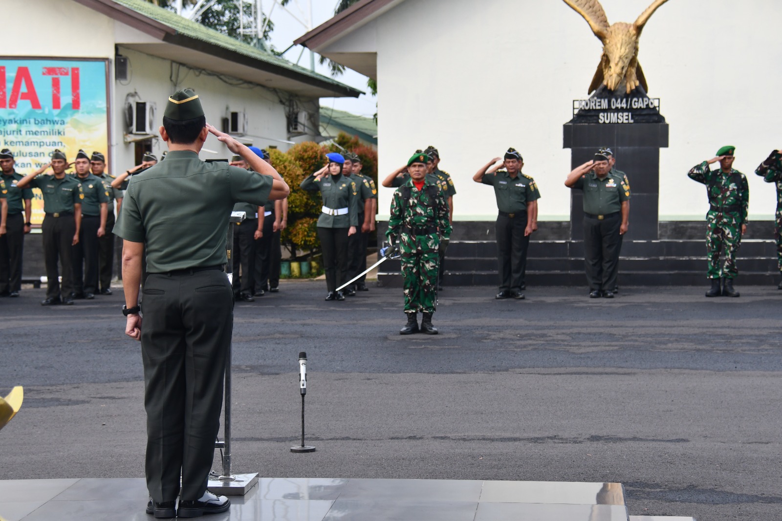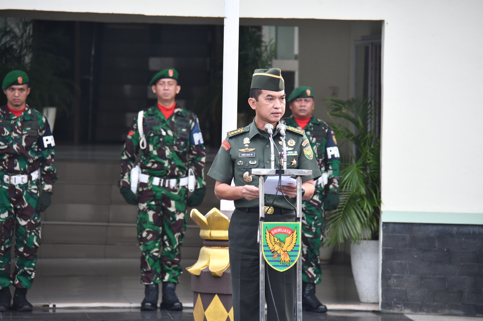 Bertindak selaku Inspektur Upacara, Kasrem 044/Gapo Kolonel Inf Andi Gus Wulandri membacakan amanat Panglima TNI Jenderal TNI Agus Subianto.