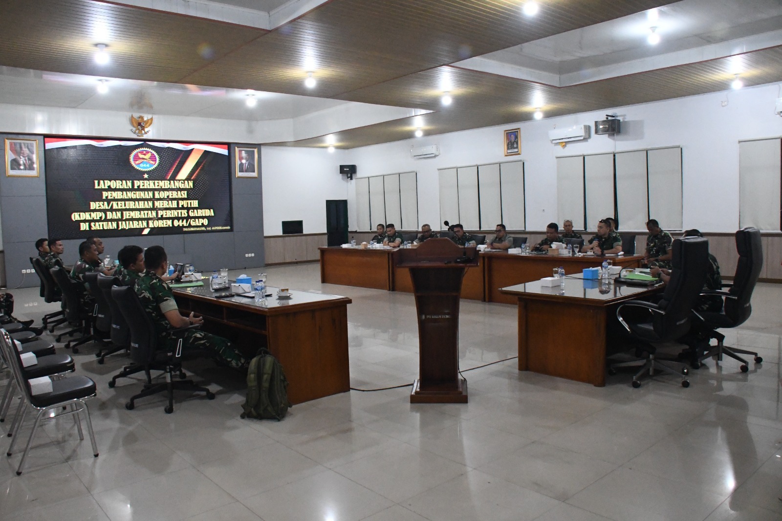 Palembang – Dandim jajaran Korem 044/Gapo memaparkan kepada Komandan Korem terkait perkembangan pembangunan Koperasi Desa/Kelurahan Merah Putih (KDKMP) serta pembangunan Jembatan Perintis Garuda di wilayah satuan masing-masing, Selasa (14/4/2026).