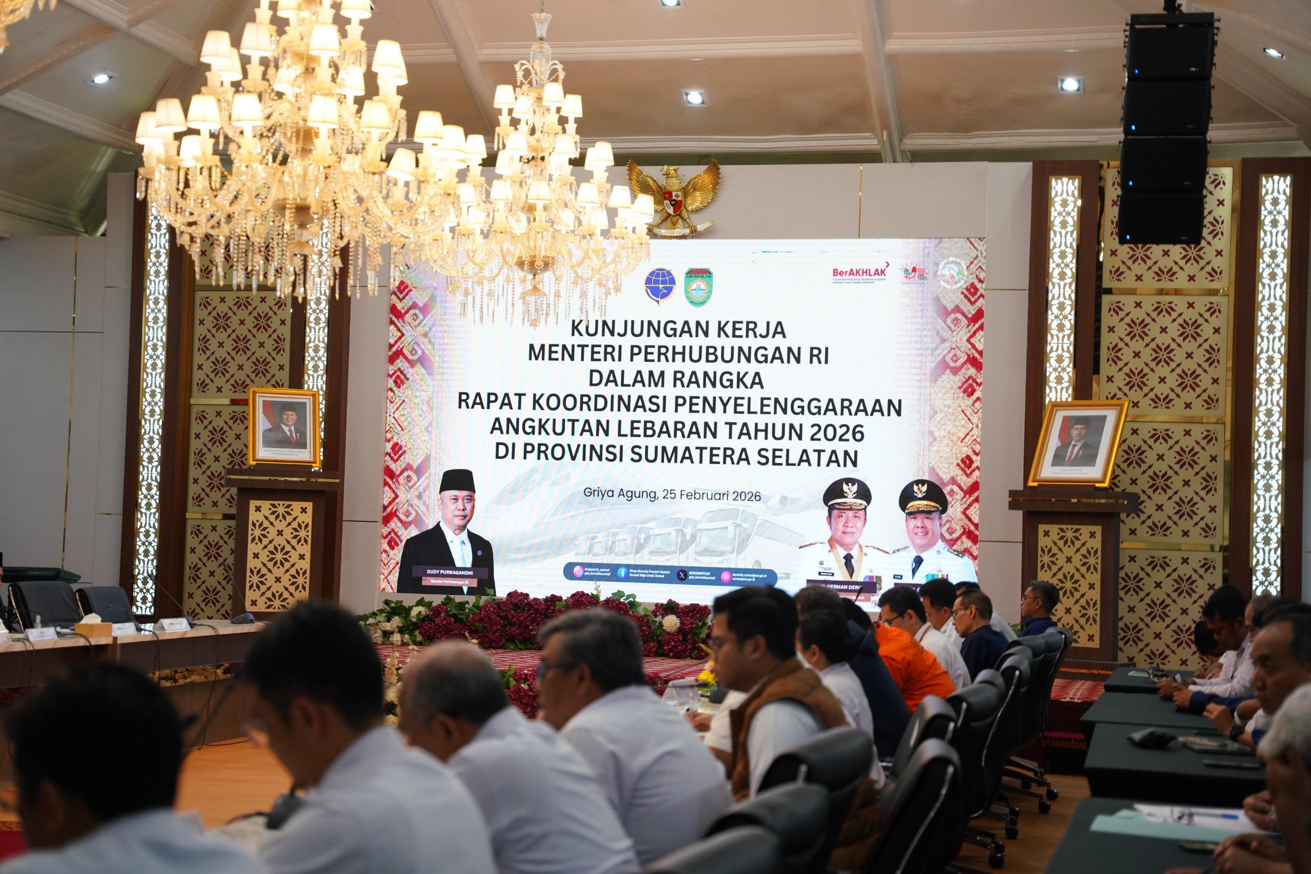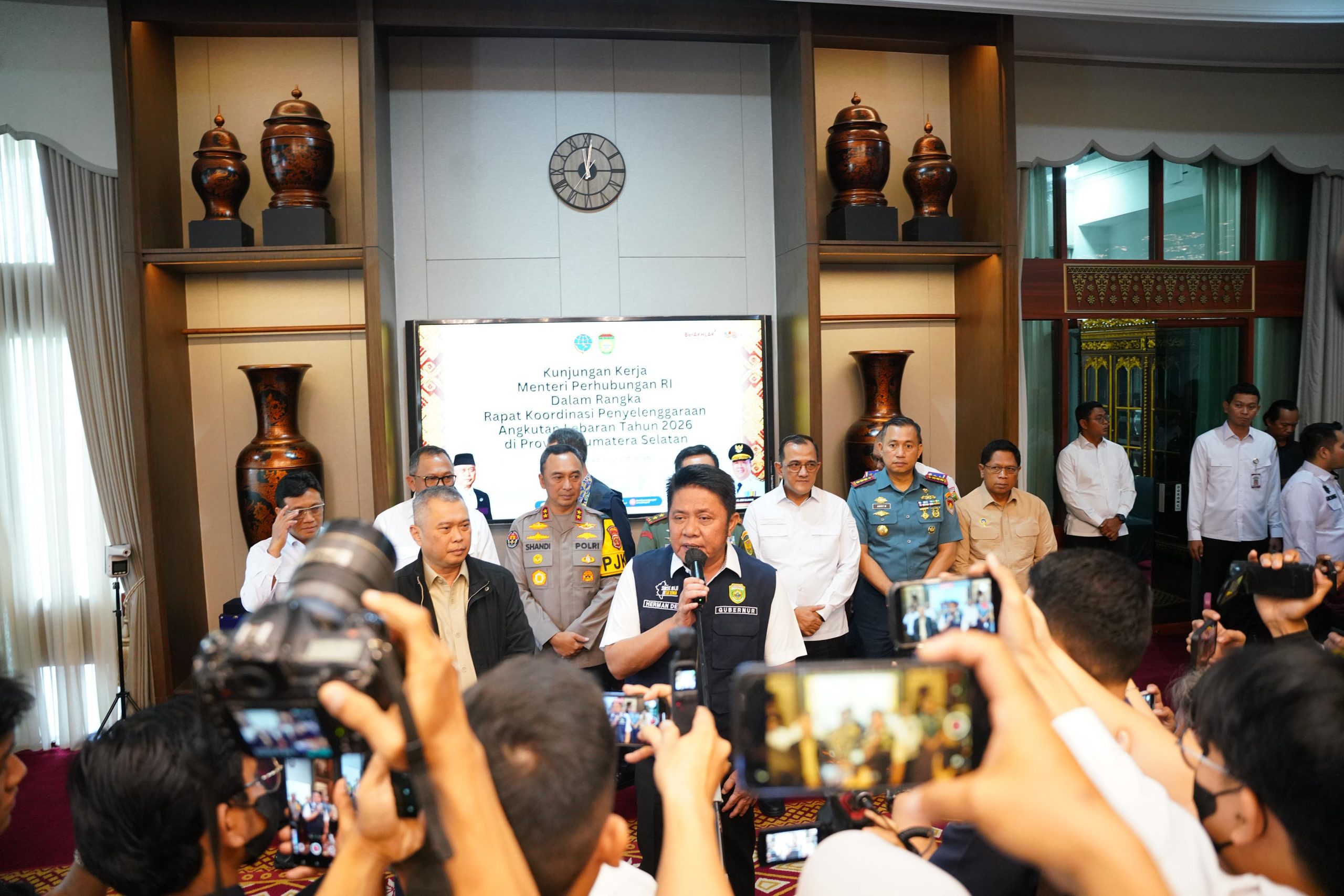 PALEMBANG -Polda Sumsel menegaskan kesiapan penuh dalam mengamankan arus mudik dan balik Idul Fitri 1447 H/2026 M. Komitmen tersebut ditegaskan langsung oleh Kapolda Sumsel Irjen Pol. Dr. Sandi Nugroho, S.I.K., S.H., M.Hum., saat mendampingi kunjungan kerja Menteri Perhubungan RI di Griya Agung Palembang, Rabu (25/2/2026).