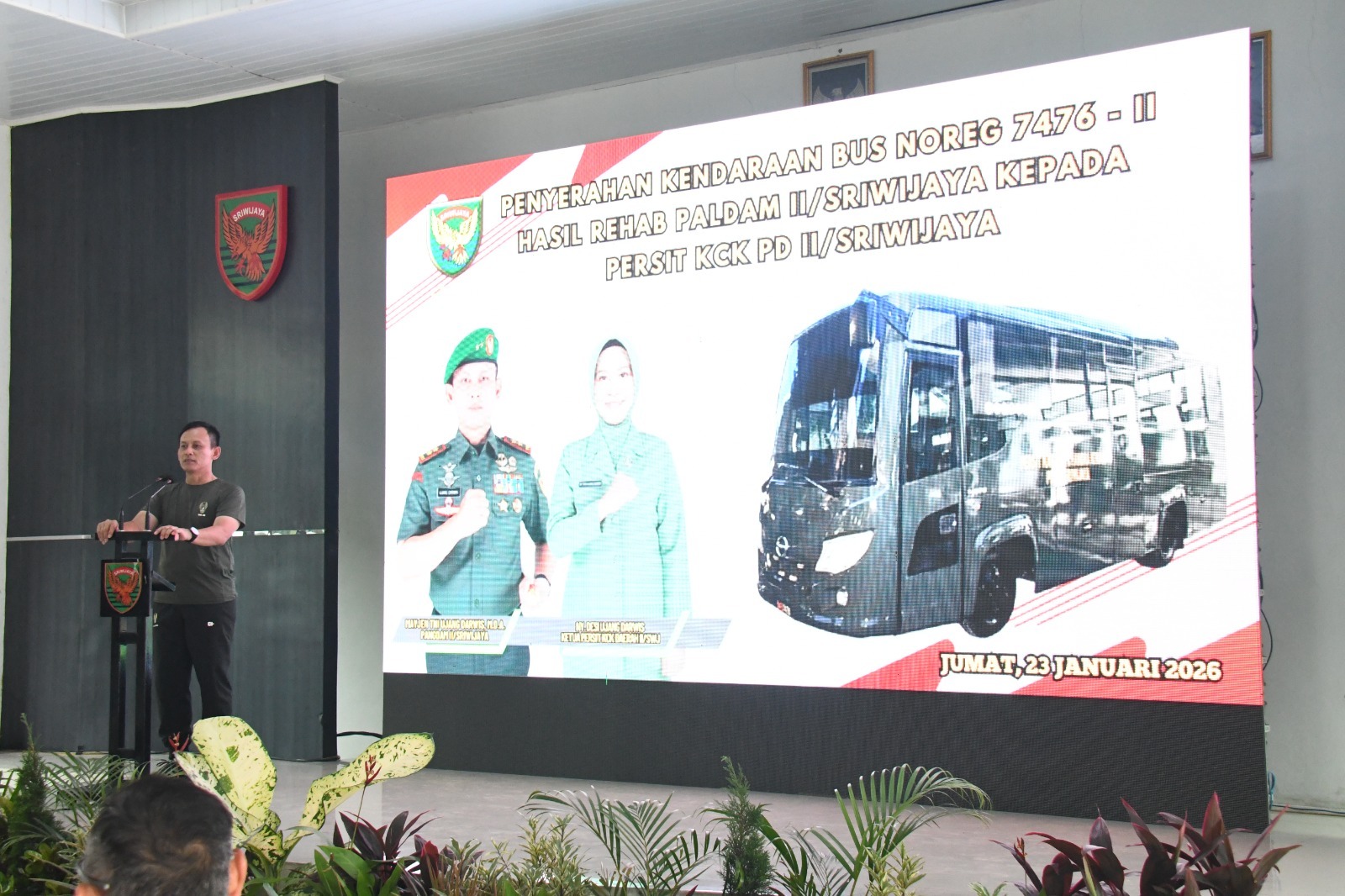 Palembang – Bertempat di Mapaldam II/Swj, Jalan Ki Ranggo Wirosantiko, Kota Palembang, digelar kegiatan Penyerahan Secara Simbolis Kendaraan Bus guna mendukung operasional Persit Kartika Chandra Kirana Pengurus Daerah II/Sriwijaya, Jumat (23/1/2026).