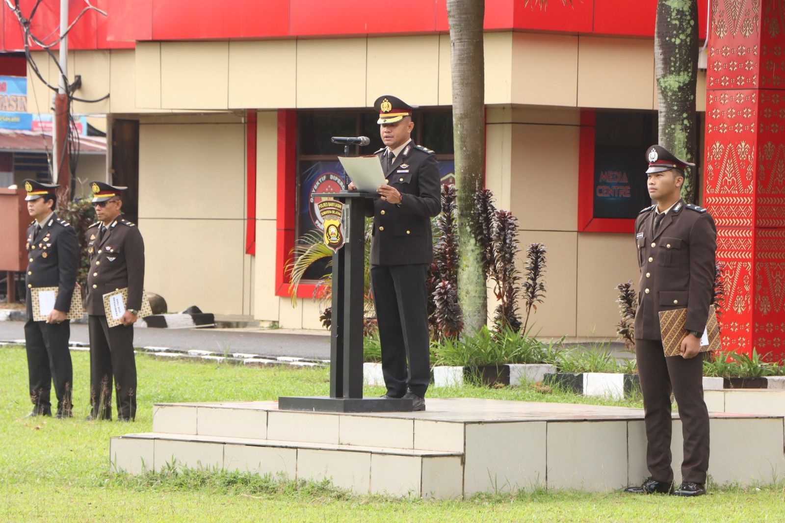 Inspektur Upacara, Kompol Azmi Halim Permana, S.I.K., M.A.P. (Kabagops Polres Banyuasin), memimpin secara langsung jalannya upacara. Kegiatan ini dihadiri oleh segenap pimpinan, perwira, bintara, dan ASN Polres Banyuasin, termasuk Kompol Ujang Ermansyah Mashan (Kabagren), Kompol Tulus Julianto, S.H. (Kabaglog), dan Akp Arfanol Amri, S.H. (Plt. Kabag SDM).