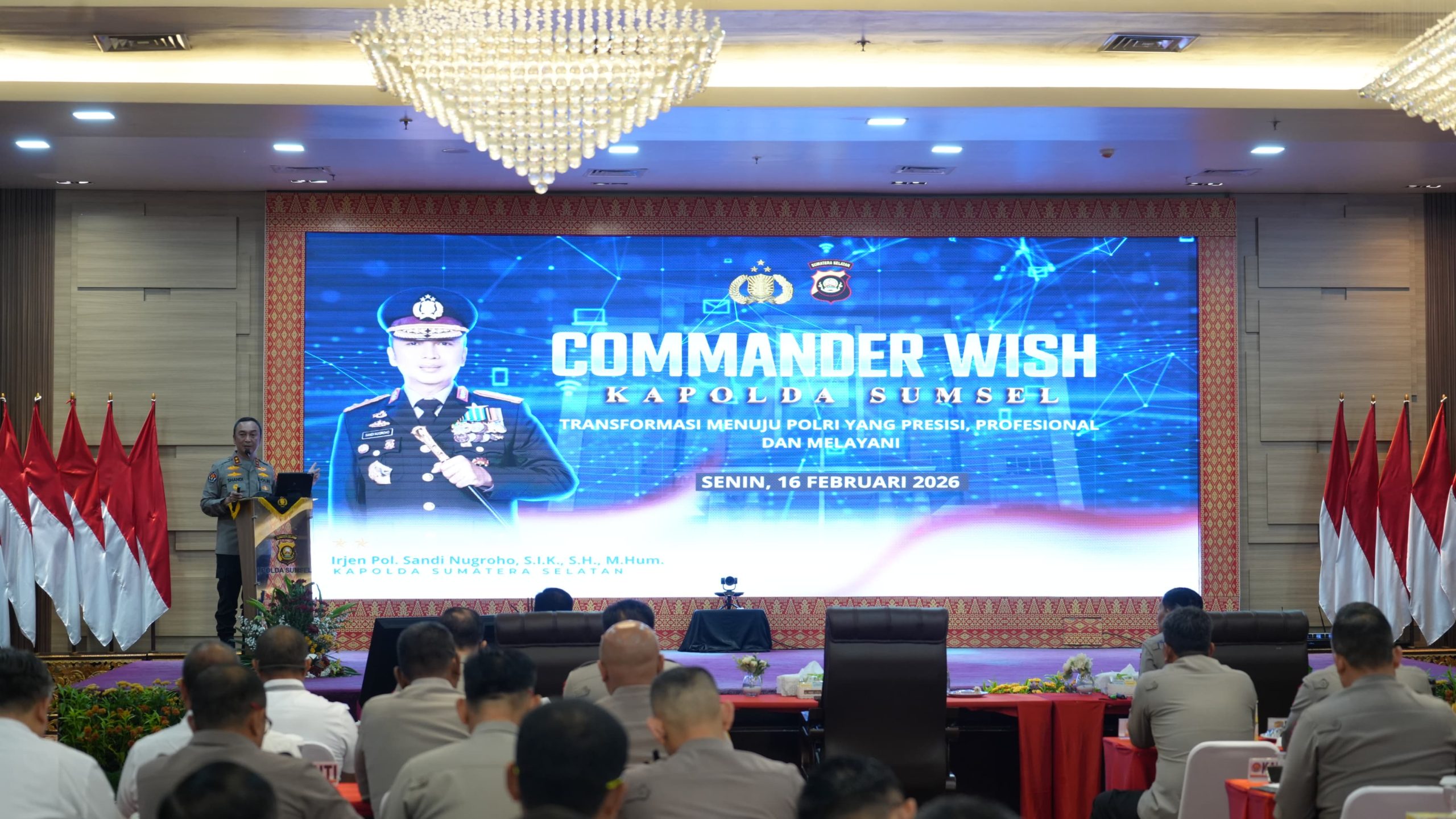 PALEMBANG 16/02/2026. Media Detik News Kapolda Sumatera Selatan, Irjen Pol. Dr. Sandi Nugroho, S.I.K., S.H., M.Hum., secara resmi menyampaikan Commander Wish tahun 2026 sebagai panduan strategis jajaran Polda Sumsel. Langkah ini merupakan bentuk transformasi menuju Polri yang Presisi, profesional, dan melayani di tengah tantangan global yang semakin kompleks.
